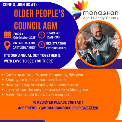 Monaghan Older Persons Information Day will take place on Friday 10th October from 9.30am to 3.30pm in Iontas Centre, Castleblayney Co Monaghan. Monaghan Older Persons Council in collaboration with Monaghan Age Friendly Programme have planned an informative and fun day out for everyone who attends. The Older Persons Council is there to support older people by bringing the issues facing older people to the Age Friendly Alliance who then collaboratively work to resolve these issues. On the day we will have information for you on Writing A Will, Age Friendly Homes programme and much more. There will be stalls filled with lots of information. A hot lunch will be served and we will finish the day off with some music. Bring a friend if you want to. All we ask is that you register to attend. Please email agefriendly@monaghancoco.ie or phone 047 73720