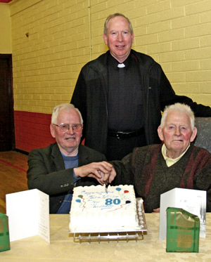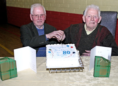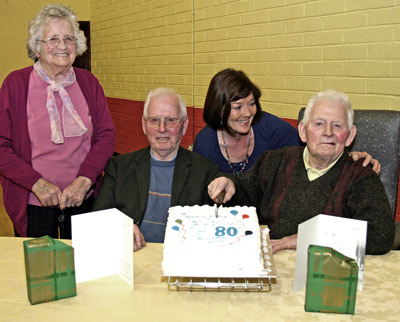 On Thursday March 4th 2010 there was a surprise in store for Pat and Willie Savage, from Emy, when they arrived at the Thursday North Monaghan Social Services Day in Emyvale Leisure Centre. Although only 90th birthdays are celebrated with a party at the Thursday Club it was decided that this 80th Birthday was special and deserved to be celebrated. Pat and Willie are twins and their 80th was surely special and after the main course the Cake arrived and the traditional cutting of the cake was held with a rousing chorus of Happy Birthday led by Pat McQuaid, Deravoy. We add our voice to everyone else in wishing Pat and Willie many more years of health and happiness.