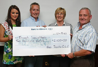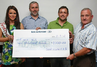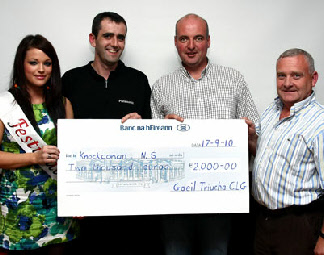 Raymond Treanor and Festival Queen, make the presentations to - on the left are Sean McGinn and Brian Rafferty, representing Knockconan NS and on right are Brian McKenna and Frank McKenna representing Deravoy NS.