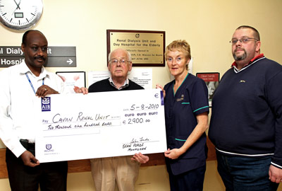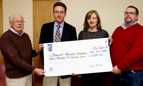 Now one year later Sean, with his family and friends, is pleased to be able to present some funding to both Cavan and Beaumont as a mark of his appreciation. A number of other transplant recipients and patients on dialysis participated and helped out with this fund-raising venture. Sean and son, Adrian, presented a cheque for €2,900 to Marie Sheridan, Clinical Nurse Manager and Dr. Yasir, Medical Registrar, of the Renal Dialysis Unit in Cavan. A cheque for €3,200 was presented by them to the Beaumont Transplant Foundation, where it was accepted by Dr. Magee, Consultant Nephrologist and Ms Aileen Counihan, Transplant Unit Co-ordinator.