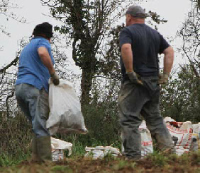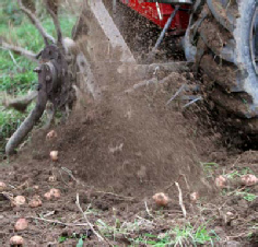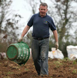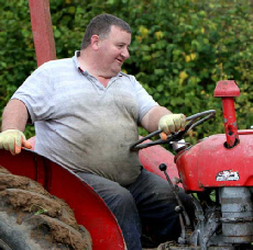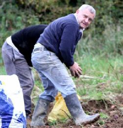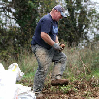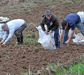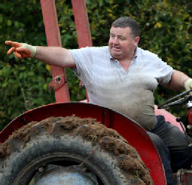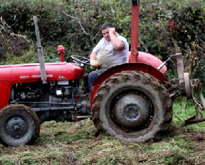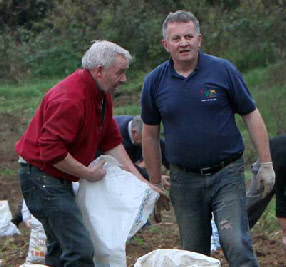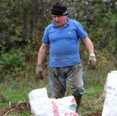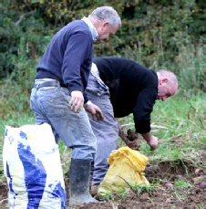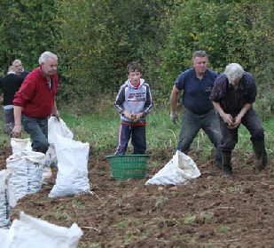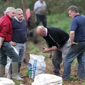 As dusk fell around the hill of Mullanderg near Moybridge I was on my way home, weary after a long drive, when I saw a man outstanding in his field, or was it someone else’s field. There he stood with strange headgear, gloved, and clabber to the knees. He was looking down the hill and my eyes followed his line of sight and I had to blink a couple of times as I was unsure if I was really seeing what I thought I was seeing. There, facing up towards the great man at the top, was a line of people, all males, bowing towards their leader. Heads and upper bodies rose up a little every so often and they moved a white object forward in front of each of them as if offering a gift to a god. Little by little they edged their way up the hill and then as if a mighty weight had been lifted from them they all stood up straight and began rubbing their backs. With that an ancient tractor headed up the same hill and spewed out round pink balls onto the ground and the ritual began all over again. I had to find out what was happening and I drove up the lane and into the field with my camera to capture this wonderful sight only to discover that it was Ciaran with a boon of men digging his few drills of spuds. Mackie had an old Ferguson with a potato digger which fired out the potatoes and the men gathered them into plastic bags. Ciaran was at the top of the hill keeping a watchful eye on what was going on down below but there was little that could go wrong. He had his 2IC (Second in Command for those who do not know) Denis keeping order and checking that only spuds went into the bags and that the spuds only went into official bags. Raymond thought at one stage that Mackie was taking full bags that he was after gathering and emptying them out again as he went up the hill but I assured him that any potato on the ground had not been gathered. Denis kicked a few sods about and discovered little nests of spuds here and there which someone had concealed to come back to collect later. Denis was suffering as was Raymond as they had been gathering the previous evening too and Denis had spent the best part of the day with the Physio. She had done such a job and he was moving so fast that I had to ask him to stand at rest so that I could get a photo of him that was not blurred with the movement. Raymond meanwhile was having difficulty in getting up when he went down and so went down very seldom. Speaking to Ciaran I discovered that he had given this crop lots of attention and was delighted with the yield. There was no blight as he had sprayed them at least six times. He guaranteed that they were the best spuds ever boiled for a dinner. One neighbour who was helping out thought he was back in 1844 as the crop was so light and he was about to forecast a famine next year. There were certainly a few empty spaces but Ciaran said that there was a large bouquet of pheasants in the area and he had allowed them to feed on a couple of drills. From the gaps they must be well fattened by now. Whatever about the pheasant Ciaran will be able to ride out the recession as he has the store filled with the best of spuds and the menu will have a potato dish every day. If anyone calls on a ceili instead of sandwiches you will get potato bread and pheasant. I left the field with a good stone of spuds but it is too early yet for me to pass judgement as we are keeping them for Sunday.