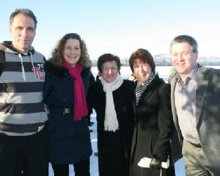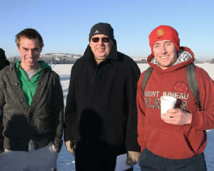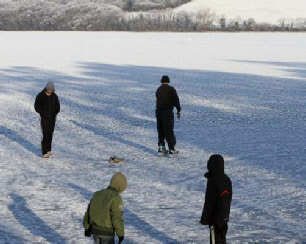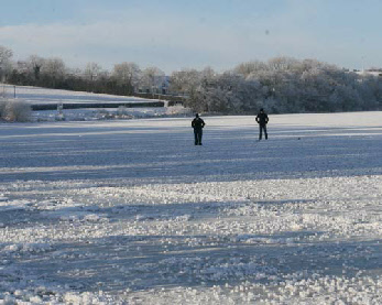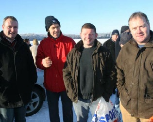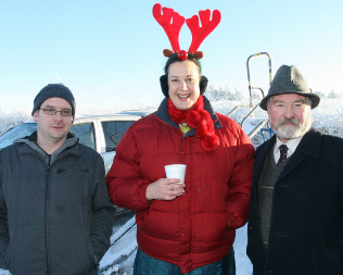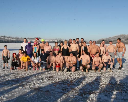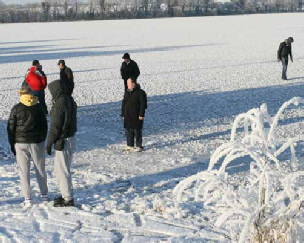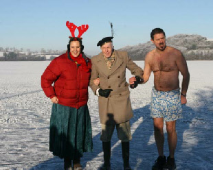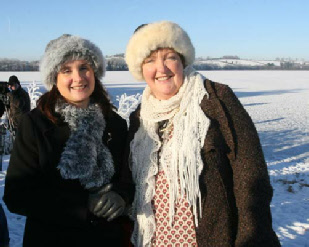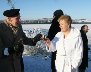 The 2010 Christmas Day swim at Emy Lake was a real challenge for everyone as conditions were extreme and Dan Rogan stated that this was totally different from anything he ever experienced with the Christmas Day Swim in its history. There was much discussion about cancelling but then it was obvious that the Swim was more than just a swim - it was a social occasion on Christmas morning that hundreds had now accepted as a tradition and they would all miss it. However the ice on the Lake was so thick that it would need heavy equipment to break and then it would be very difficult for swimmers with a high risk of lacerations on legs and feet. In the end it was decided that the tradition would not be broken and that all intended swimmers would tog-out and have their picture taken on the ice and that this would fulfil their obligation as it was not their fault that they could not get at the water. As it was and despite the cold and freezing conditions almost 40 participants braved the ice and the artic breeze. Paul McGlade, Chairman of the Friends of the Intellectually Disabled, on behalf of the organising committee thanked everyone for attending, those who helped, and those who contributed to the fund. He also thanked Castle Leslie who supplied piping hot and nourishing soup for everyone and Sammy, Mark and Sir Jack were present. He also thanked the Civil Defence members present and Murphy Video services for recording the event. A big crowd of spectators turned out again and there was a great buzz among them but there was little hanging about afterwards as the cold was beginning to reach places that are normally warm and so it was time to head for the warmth of home and the Christmas dinner. However anyone who wouldlike to make a donation to the cause can send it to Dan Rogan, Paul McGade or Donal Kenny.