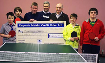 Thanks and great appreciation goes to Emyvale District Credit Union Ltd., which has presented €200 sponsorship to the Donagh Community Games Table-tennis section. This very welcome funding will help to purchase much needed equipment which will assist in the training of the team for this year’s Community Games competitions. Our photo shows Sean Skinnader of the Credit Union presenting the cheque to the team and mentors.