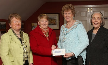 Above Marie Murphy and Nancy McCluskey present the Jolly Joggers cheque to Mary McGrane and Maeve Hackett and on the right Jolly Jogger members join in.