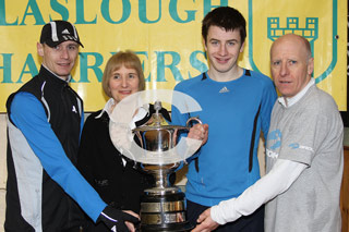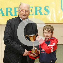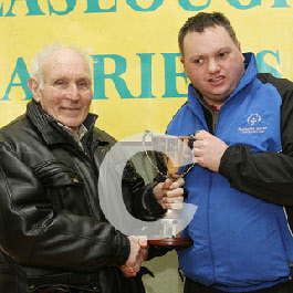 Fr. Corrigan presents the John Curley Cup to winner, Mark Conroy