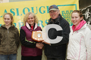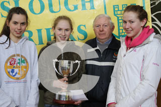First Ladies home - Clodagh O’Reilly with the Felix Sherry Cup; Alicia Boylan and Eadaoin O’Reilly with Patsy Kelly