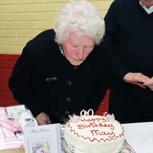 On left May cuts the cake with family members while on right she is pictured with some of the committee.
