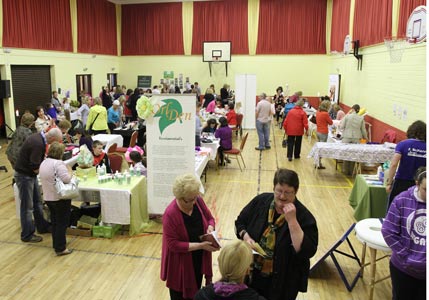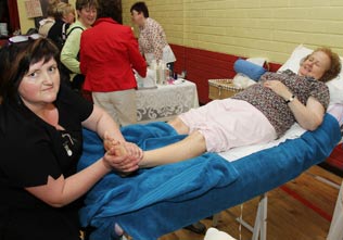 On Saturday, May 7th Emy Belles hosts an exhibition of health, beauty and holistic products and treatments for the public in Emyvale Leisure Centre from 5pm to 8pm. Over 20 exhibitors were present to demonstrate their therapies, skin care products, arts and crafts and physiotherapy. There was massage, reiki, and herbal products to bring all sorts of benefits to the body. Many of these were appropriate for the male species but they were scarce on the ground but a very big number of the female population attended. Many of the ladies went home walking on air after the foot massage and I am told that many more availed of the treatment but only after the camera left the building.