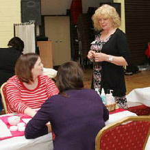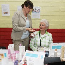 Kay Cassidy, Avon Rep, demonstrates some of the products to Breige McKenna